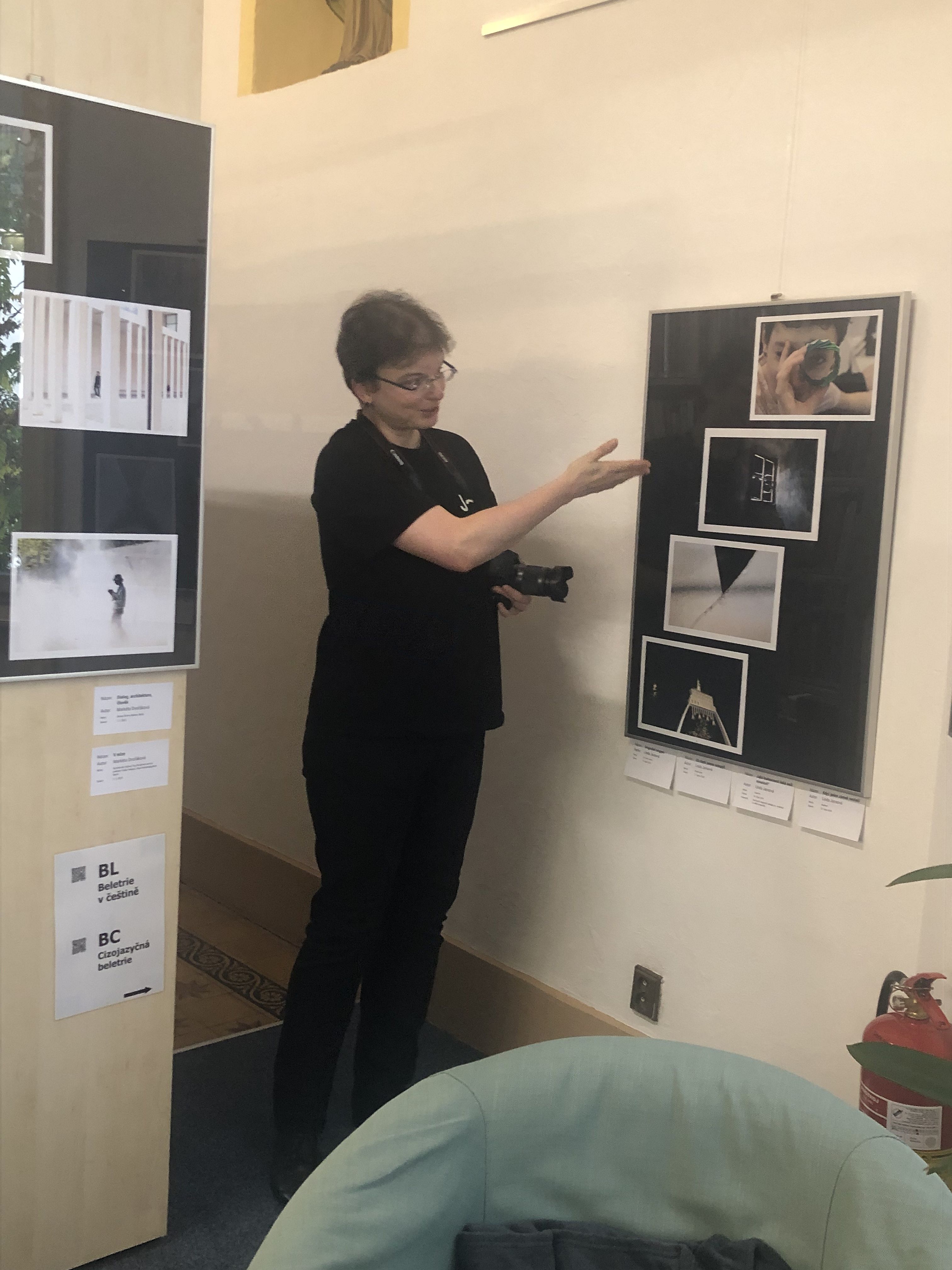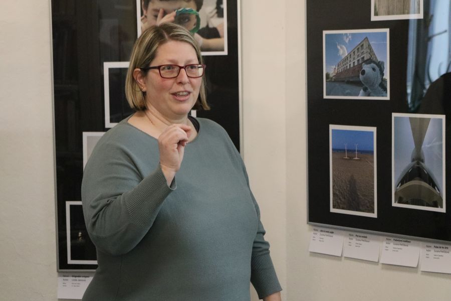 Žena s brýlemistojí před stěnou, na které jsou zavěšeny rámy s fotkami má ruku nahoře, jako by něco ukazovala a je vidět, že něco povídá.