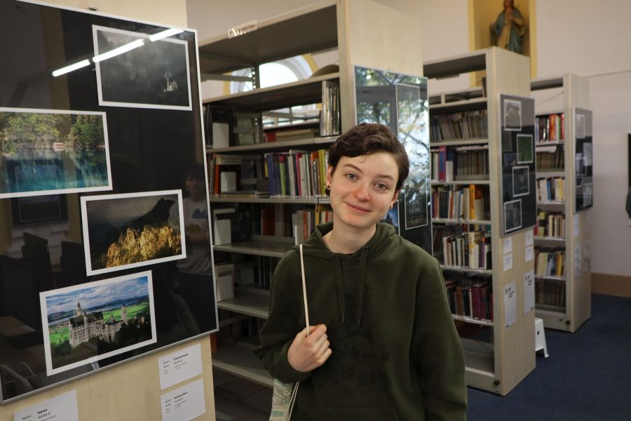 Skupina lidí a dětí stojí vedle regálů, na jejichž boční straně jsou vystavené fotky