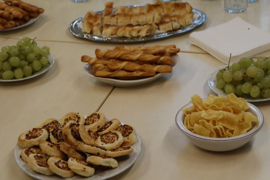 Skupina tří žen a jeden muž stojí proti sobě a povídají si, v ruce drží sklenice a jídlo