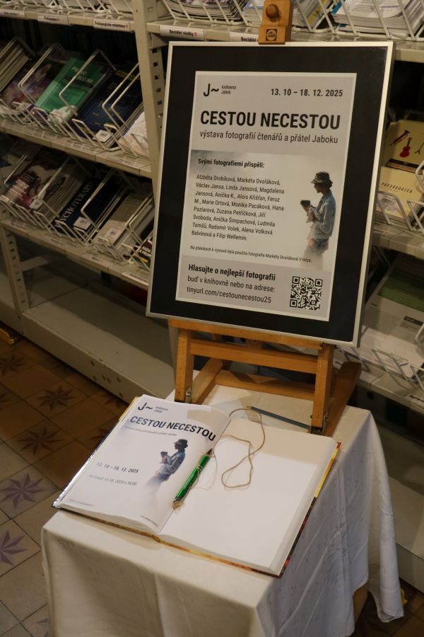 Stolek s návštěvní knihou a plakátem s pozvánkou na výstavu ve stojanu.