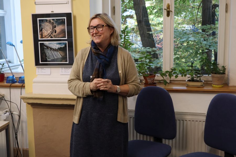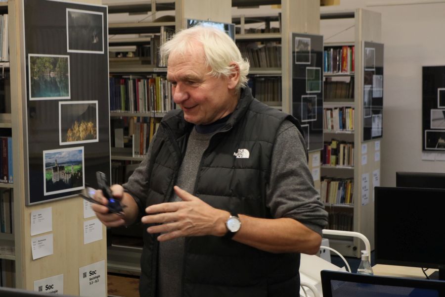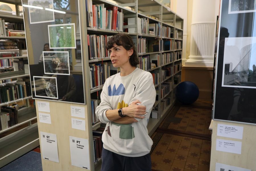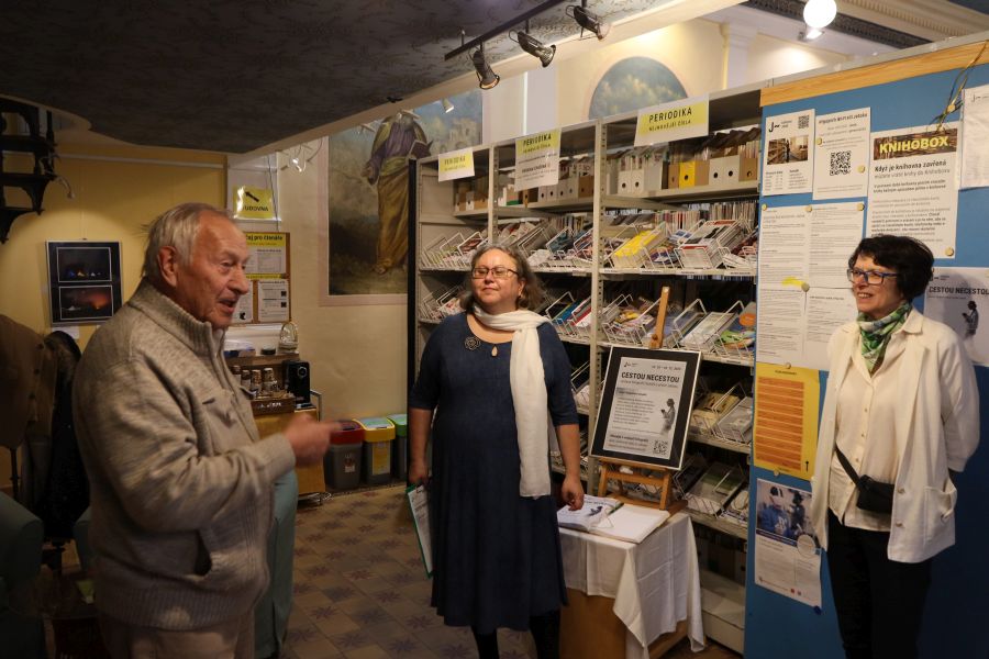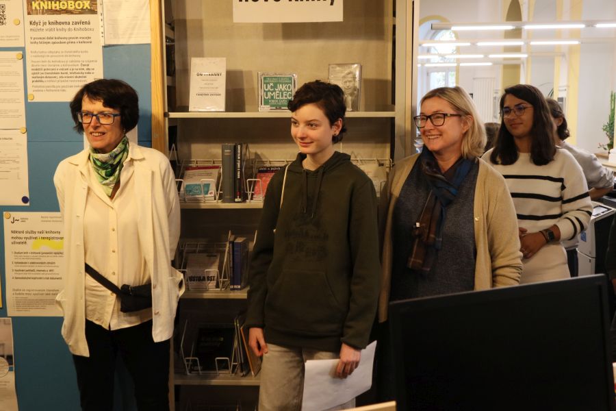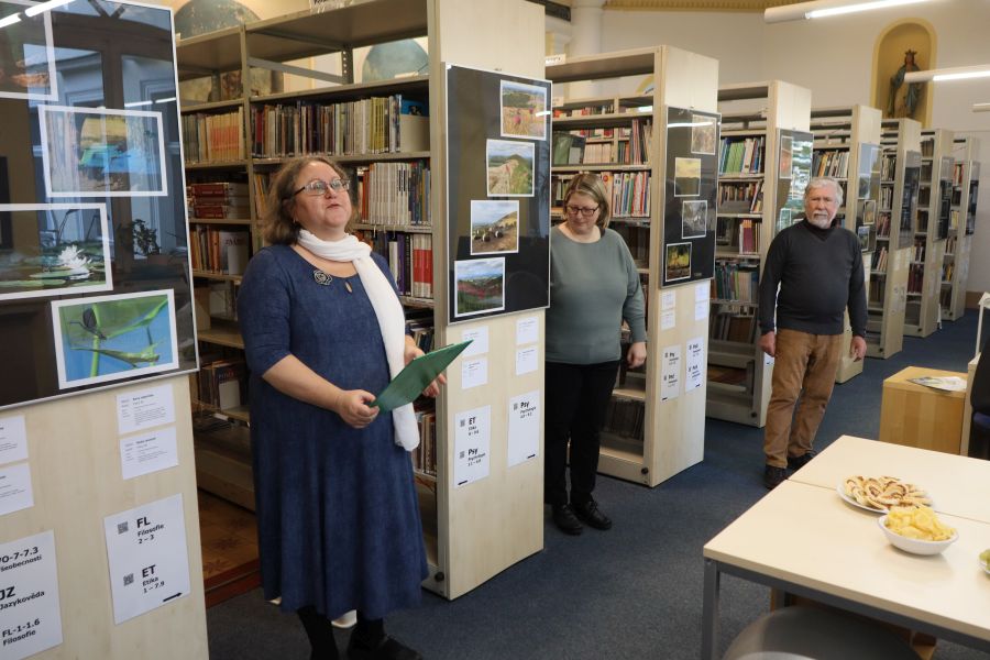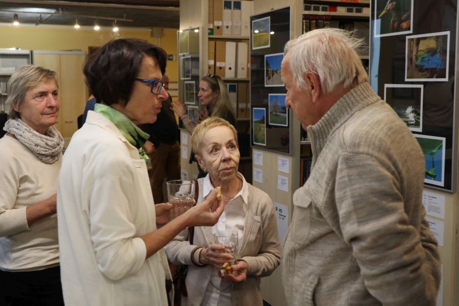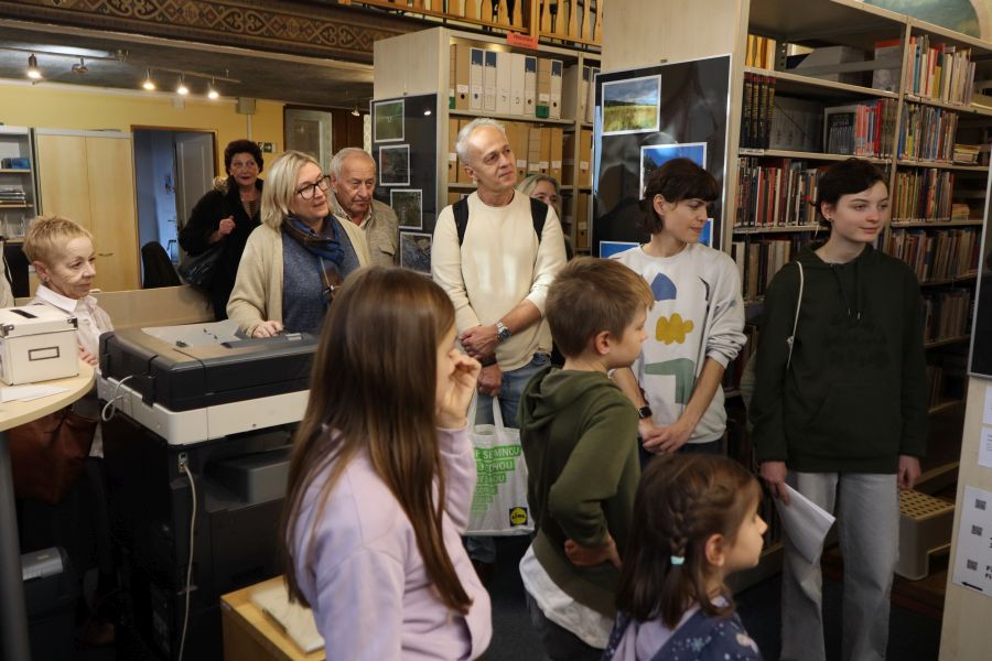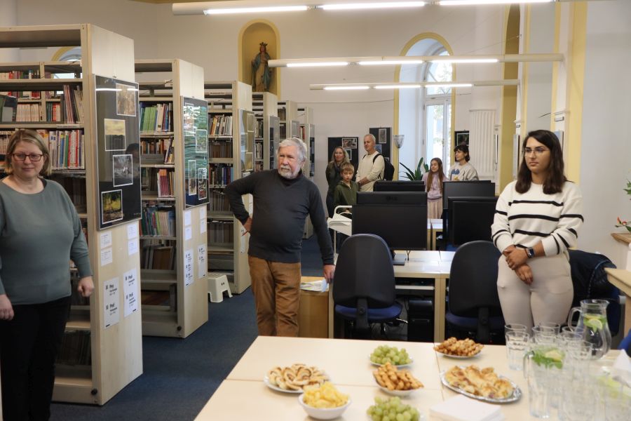 Lidé stojí v knihovně vedle regálů n akterých visí rámy s vystavenými fotografiemi a dívají se jedním směrem. V popředí je stůl s občerstvením