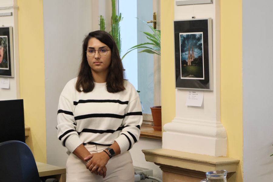 Mladá dívka s tmavými dlouhými vlasy  v pruhovaném svetrustojí vedle fotografie kostela za soumraku.