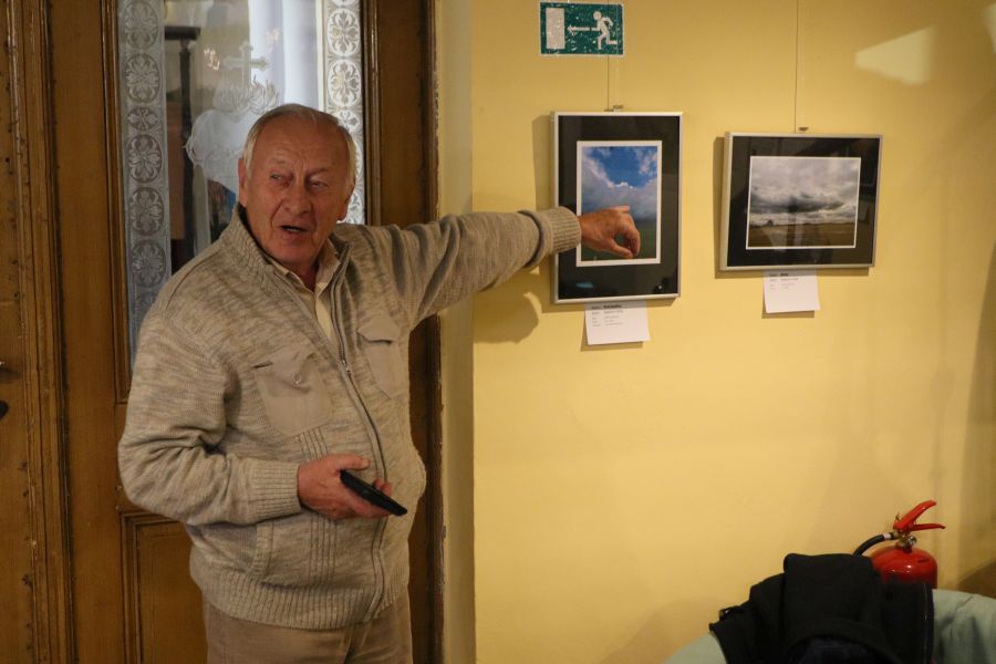 Starší muž ukazuje na vystavenou fotografii a směje se