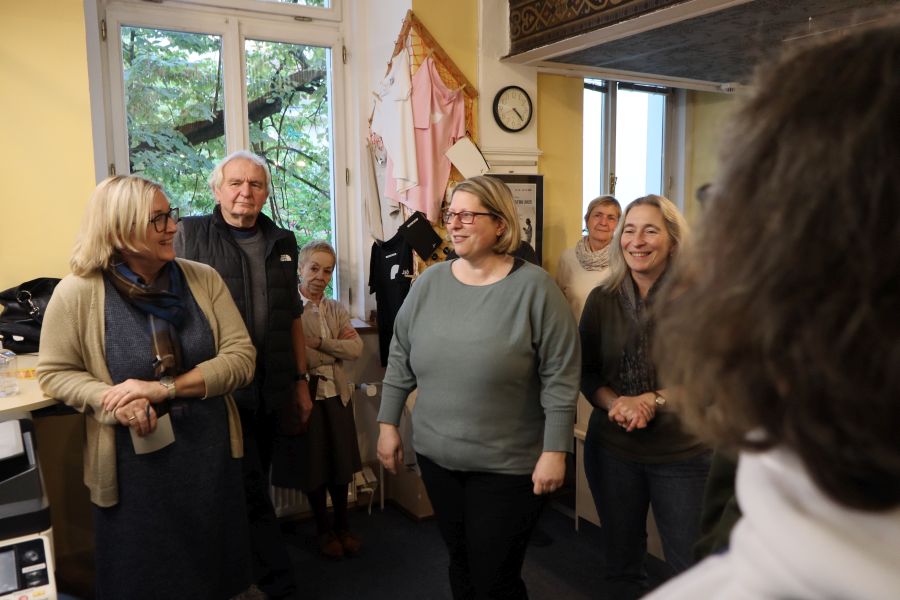 Skupinka čtyř žen stojí před nástěnkou a někoho sledují