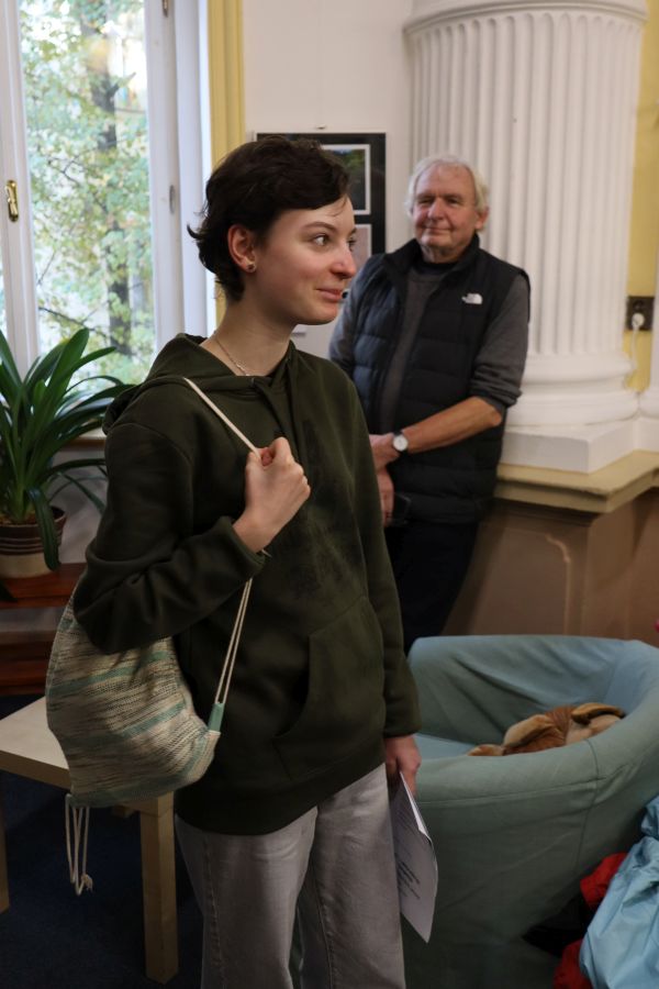 Stojící dívka s taškou přes rameno něco vykládá, za ní stojí starší muž a usmívá se