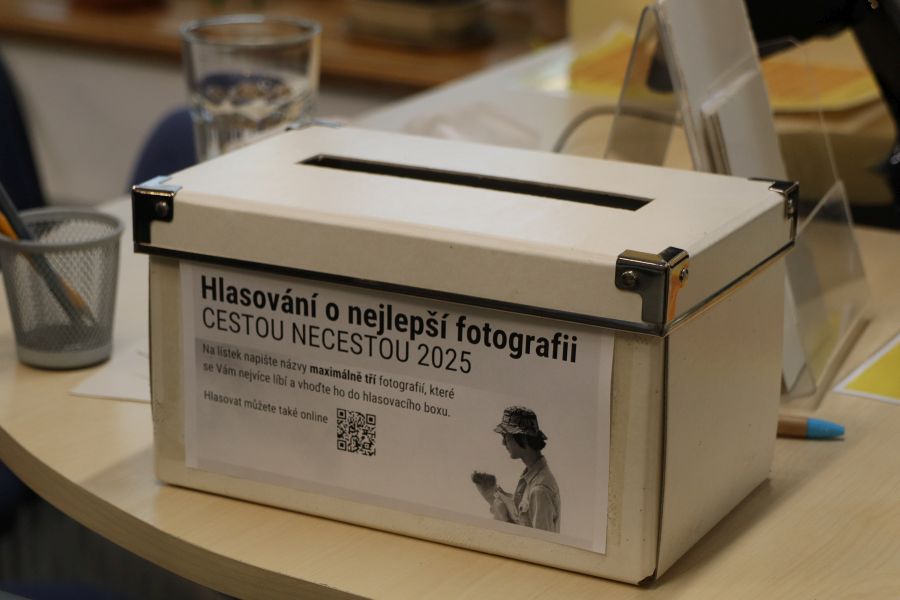 Krabice s otvorem pro vkládání papírků, na krabici jsou informace o hlasování o nejlepší fotografii
